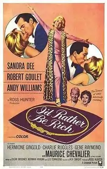 I'd Rather Be Rich is a 1964 romantic comedy film with musical aspects directed by Jack Smight, produced by Ross Hunter and starring Sandra Dee.[1] The film focuses on a dying man who wishes to meet his granddaughter's fiancé, but he is unavailable, so the woman persuades another man to substitute for him. Then the grandfather recovers.[2][3]