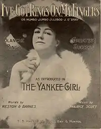 I've Got Rings On My Fingers is a popular song written in 1909, words by Weston and Barnes, and music by Maurice Scott. It concerns an Irishman named Jim O'Shea, a castaway who finds himself on an island somewhere in the East Indies, whereupon he is made Chief Panjandrum by the natives because they like his red hair and his Irish smile. He then sends a letter to his girlfriend, Rose McGee, imploring her to come join him.