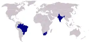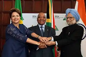 On 6 June 2003, Yashwant Sinha (External affairs minister of India), Celso Amorim (Foreign minister of Brazil) and Nkosazana Dlamini-Zuma (Foreign minister of South Africa) met in Brasilia, where the IBSA Dialogue forum was formalized through the adoption of the "Brasilia Declaration".[1] The IBSA Dialogue forum facilitates regular consultations at senior officials level, government (summit) levels as well as amongst academics, intellectuals and other members of the civil society.[1] By some experts, it is also seen as an endeavor to challenge the international system by Pivotal Middle Powers through peaceful convincing, instead of other means.[2]