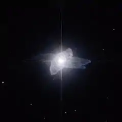 The brightest portion of the nebula shows a quadrupolar structure, with elongated bipolar lobes, all surrounded by a faint halo.[5]