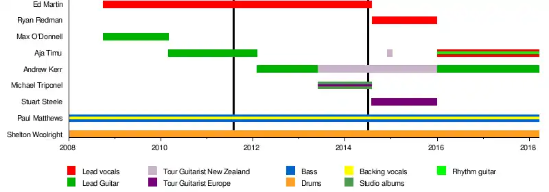 In 2010 Aja Timu who had played with Matthews (Stylus) and Woolright (Blindspott) replaced Max O'Donnell on guitars.