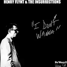 The duo specialized in a kind of agitprop approach to topical songs as they evolved into a larger group, eventually adding jazz musician Paul Breslin on upright bass and organist Art Murphy, and taking the name Henry Flynt & the Insurrections.[6] Many of the band's songs were highly satirical, rife with references to topics such as "napalm", "Uncle Sam", and "CIA-backed coups".[1] They recorded songs onto rehearsal demos in 1966, but, due to Flynt and DeMaira's wariness of commercial success, the material was not released until years later.[3] The band broke up shortly thereafter.[3] The group's demo tapes were re-issued in 2004 as the album I Don't Wanna, on Locust Music.[1]