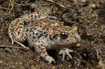 The Iberian midwife toad grows to a length of about 40 mm (1.6 in), males being rather smaller than females. The snout is rounded and the eyes large, with vertical slit pupils. Tiny, often orange, warts occur on the upper eyelids. The parotoid glands are relatively small and the tympani are distinct. Many tubercles are seen on the body and concentrations of glandular warts are under the arms, in the groin area, and on the ankles. The limbs are fairly short. The colour of the upper surface is brownish-grey with dark spots, and the warts are often reddish. The underparts are unspotted and greyish-white.[3]