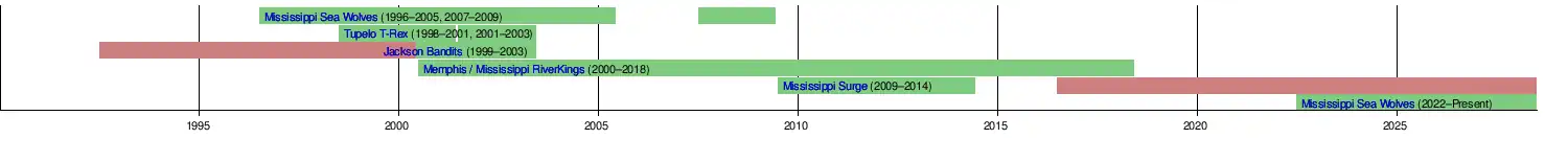 Like many other states in the Deep South, Mississippi did not see its first official ice hockey team until the 1990s. The rise and expansion of the ECHL brought the Mississippi Sea Wolves into being in 1996 and the team saw some interest from the locals. After two seasons, the attendance figures began to dwindle but the team put together a tremendous season and won the league championship in 1999. Despite the title, and continued success on the ice, the Sea Wolves dropped from over 6,000 per game in the 90s to just over 3,000 in 2003.[2] Even with their attendance halved, the team soldiered on and began to see slight improvements in the mid-2000. However, the destruction brought by Hurricane Katrina in 2005 damaged the team's home rink, the Mississippi Coast Coliseum. The franchise was forced to go dormant for two years while it was repaired but the Sea Wolves did finally return in 2007.[3]
