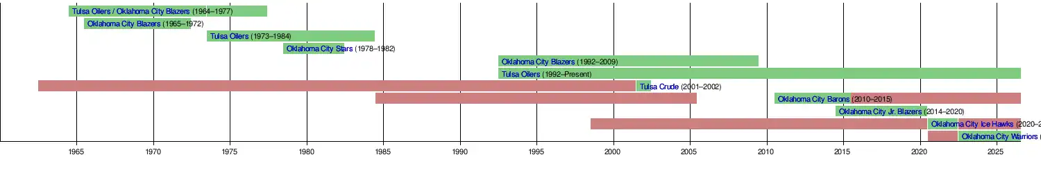 Tulsa Oilers | Tulsa | CPHL | 1964–1973 | Oklahoma City Blazers (second) |