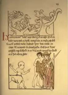 The Icelandic Physiologus is a translation into Old Icelandic of a Latin translation of the 2nd-century Greek Physiologus. It survives in fragmentary form in two manuscripts, both dating from around 1200, making them the earliest illustrated manuscripts from Iceland and among the earliest Icelandic manuscripts generally.[1] The fragments are significantly different from each other and either represent copies from two separate exemplars or different reworkings of the same text.[2] Both texts also contain material that is not found in standard versions of the Physiologus.[2]