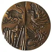 The modern coinage of Iceland frequently displays elements of the contemporary national coat of arms, including the shield and/or the four "guardian spirit" supporters. One notable example of a numismatic display of Icelandic heraldry is the 1974 bronze medallic coin pictured above.