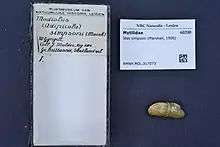 In 1900, some fishermen trawling the seabed between the Hebrides and the Shetland Islands brought to the surface part of a whale skull to which was attached about twenty bivalve molluscs. They passed their find to James Jenkins Simpson, a shell collector in Aberdeen, and he sent them on to the conchologist James Thomas Marshall.[2] Marshall determined that the molluscs were new to science, and formally described them, naming the new species Myrina simpsoni.[1] Apart from one specimen which was found inside a baulk of drifting pinewood, all specimens seen since then have been associated with the skeletons of dead whales, making this mollusc the first known species with such a restrictive habitat requirement.[2] The species has since been transferred to the genus Idas, making it Idas simpsoni.[1]