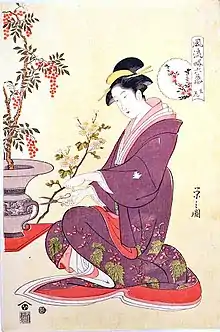 The pastime of viewing plants and appreciating flowers throughout the four seasons was established in Japan early on through the aristocracy. Waka poetry anthologies such as the Man'yōshū and Kokin Wakashū from the Heian period (794–1185) included many poems on the topic of flowers.[4] With the introduction of Buddhism, offering flowers at Buddhist altars became common. Although the lotus is widely used in India where Buddhism originated, in Japan other native flowers for each season were selected for this purpose.[4]