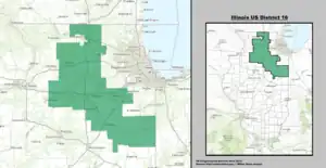 The congressional district covers parts of DeKalb, Ford, Stark, Will and Winnebago counties, and all of Boone, Bureau, Grundy, Iroquois, LaSalle, Lee, Livingston, Ogle and Putnam counties, as of the 2011 redistricting which followed the 2010 census. All or parts of Belvidere, Channahon, DeKalb, Dixon, Loves Park, Machesney Park, Ottawa, Morris, Pontiac, Rockford and Streator are included.[4] The representatives for these districts were elected in the 2012 primary and general elections, and the boundaries became effective on January 5, 2013.