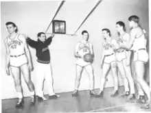 Champaign High School basketball coach Harry Combes was hired to succeed Doug Mills as Mills left the position to focus on his duties as the athletic director. Through his first five seasons as head coach, Combes led the Fighting Illini to three NCAA Final Four appearances in 1949, 1951, and 1952.[2] During his tenure as coach, Combes increased the Fighting Illini's offensive output by changing their style of play. Combes implemented Full-court press defense, causing turnovers at a high rate which translated into Fast break points.[2]