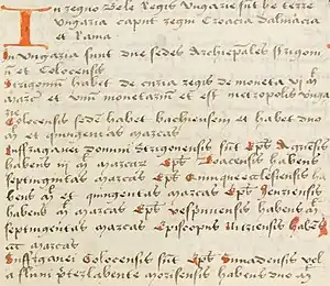 According to the earliest opinions (for instance, Ferenc Baumgarten), the above account was made for the purpose of papal tax collection for the Roman Curia. The document lists the revenues of the two archbishops and their suffragans, in addition to mentioning that Esztergom had its own mintage and data also refer to the two Dalmatian archdioceses, which at that time had a total of ten suffragan bishoprics, but their names and income are not detailed in the list.[4]