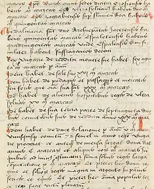 János Barta and Gábor Barta argued both the real size and the internal proportion of the king's considerable incomes are more than doubtful.[14] The two historians compared it with the annual incomes of later kings (again using the pure silver as a common unit of measure), and according to this, only Matthias Corvinus approached the amounts found in Béla's income register 300 years later, in the 1480s (with annual 703,000 golden florins, an equivalent to 27,775 kg of pure silver), which casts doubt on the authenticity of the Béla-era figures. They argued the amount of Béla's income from the compulsory annual exchange of coins (11,201 kg of pure silver) assumes a surreal scale in annual production of precious metals (35,000 kg silver yearly), thus the amount is completely uncredited, or the data does not only contain the numbers for the mandatory coin exchange (the so-called "chamber's profit"), but also revenues from coinage, silver mining (in Selmec and Radna) and gold mining.[16] Béla's amount from salt mining and trade point again only to the fact that it was reckoned about 25 percent more to the reality in the age of his reign, after analyzing the increase in the population of Hungary and the parallel increase in the demand for salt and production costs in the upcoming centuries (during the rule of Sigismund then Matthias).[17] Béla's significant income from the royal estates (60,000 marks) shows that at that time the monarch was still the largest landowner in the country, owning more estates than all the nobles combined (two-thirds part of the entire kingdom). He also maintained the taxation of royal estates that fell into private hands. The disintegration of the royal landholding system took place in the 13th century, during the reigns of Andrew II and Béla IV.[18] The high amount of tax from hospes (guest) communities from Transylvania (15,000 marks) reflects that this category did not only include Transylvanian Saxons, but other ethnic groups (e.g. Székelys, Walloons, Pechenegs and Vlachs).[18] Even with this, the overcounting can therefore be at least doubled, or even greater, if the Székelys, for instance, cannot be classified among the "foreign" peoples paying tribute to the king.[19]