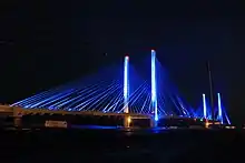 The Indian River Inlet Bridge is a cable-stayed bridge, consisting of four pylon towers with 152 stays supporting the bridge.[2] The pylons are located on land in order to avoid erosion from the inlet.[4] The bridge has a total length of 2,600 feet (790 m) and a total width of 107.66 feet (32.81 m). The span of the bridge is 950 feet (290 m) with an overhead clearance of 45 feet (14 m). The height of the pylon towers is 247.5 feet (75.4 m) above sea level.[5] The bridge has a fiber-optic system that monitors it for issues that could affect its structural integrity. The bridge is designed to last 100 years.[6]