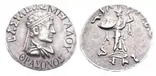Coin depicting the Greco-Bactrian king Euthydemus 230–200 BC. The Greek inscription reads: ΒΑΣΙΛΕΩΣ ΕΥΘΥΔΗΜΟΥ – "(of) King Euthydemus".