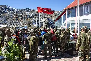 Himveer Wives' Welfare Association is a welfare wing of the Indo-Tibetan Border Police (ITBP).[14] It is a non-profit organisation that works for welfare of spouses, children or any dependents of ITBP personnel.[15] It is registered under the Societies Registration Act, 1860. The association aims to rehabilitate battle casualties and widows of those who are killed in action in the line of duty. Other than that, the association organises vocational training and empowers the beneficiaries. There are more than 88,000 members in the association. The association also works for the welfare of local population in the remote Himalayan region.[16] The formal registration of the family welfare organization of ITBP named "Himveer Wives' Welfare Association" was done on 19 May 1998 in New Delhi. Its motto is ‘Development through active involvement’. It organises annual exhibitions to showcase rare products of Himalayan region, the profit of which is used for welfare of the families of ITBP.[17][18] It also honors Veer Naris (War Widows) on special occasions and provides them assistance when needed.[19] It organises its Raising Day every year and announces various welfare programmes for its members as well as conducts training programs.[20][21]