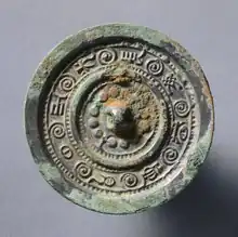 An Inscribed mirror (銘帯鏡, Meitai-kyō, also "variant character inscribed mirror" (異体字銘帯鏡, ita ijime itai kyō))[1] is a type of Chinese bronze mirror in which an inscription band is the main design on the reverse side.[2] The name variant characters (異体字, itaiji) refers to the unique design of the inscription, but they are sometimes simply called an inscribed mirror (銘帯鏡, Meitai-kyō).[1] Okamura Hidenori attributes the mirror to the late Pre-Han period, from the early 1st century BC to the early 1st century CE[1] They entered Japan in the mid- to late Yayoi period, mainly through northern Kyushu, and were later produced in Japan.[3][4] Not all mirrors with Chinese character inscriptions fall into this category but rather ones with variant characters (異体字, itaiji) with specific characteristics are considered to be in the category.[5][2]