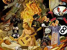 The collage on the album cover was created by Smith[18] and is called God Told Me to Skin You Alive, a reference to the Dead Kennedys song "I Kill Children". The cover art contains an image (the dentist) that was originally used in a collage featured in the inside cover art of Dead Kennedys' album Plastic Surgery Disasters (1982). Smith knew drummer Tré Cool from Green Day's time at Lookout! Records and told Cool that if he ever needed album artwork that he should call him.[17] The cover art features several hidden images: a naked woman, three fairies, and several other ghostly faces in the flames.[17] There are also three skulls on the entire album cover and back, one for each member of Green Day. One of the skulls requires the viewer to tilt the piece at an angle. The hidden skull is taken from Hans Holbein's 1533 painting The Ambassadors.[17] Green Day's version, however, is slightly different from the original, with the woman holding Armstrong's iconic Sonic Blue Fernandes imitation Stratocaster rather than an acoustic guitar.[17]
