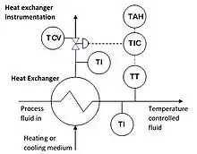• In industrial applications gaseous or liquid fluids may be heated or cooled. This duty is undertaken in a heat exchanger, whereby the fluid is heated or cooled by heat transfer with a second fluid such as water, glycol, hot oil or another process fluid (the heating or cooling medium).[5][4] Temperature control is used to maintain the desired temperature of the first fluid. A temperature sensor transmitter (TT) is located in the first fluid at its outlet from the heat exchanger. This measured temperature is fed to the temperature controller (TIC) where it is compared to the desired set point temperature. The output of the controller, which is related to the difference between the measured variable and the set point, is fed to a control valve (TCV) in the second fluid to adjust the flow of the heating or cooling medium.[1] In the case of a fluid being cooled, if the temperature of the fluid rises the temperature controller acts to open the TCV increasing the flow of the cooling medium which increases the heat transfer and reduces the temperature of the first fluid. Conversely if the temperature falls the controller acts to close the TCV which reduces the heat transfer increasing the temperature of the first fluid. In the case of heating medium with the falling temperature of the first fluid the controller would act to open the TCV to increase the flow of heating medium thereby raising the temperature of the first fluid. The controller (TIC) may also generate high (TAH) and low temperature (TAL) alarms to warn operating personnel of a potential problem.[4]