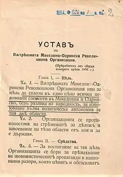 Art. 1. – The goal of the Internal Macedonian-Adrianople Revolutionary Organization is to unite any and all dissatisfied elements in Macedonia and the Adrianople Vilyaet without regard to their nationality so that political autonomy can be gained for these two regions.