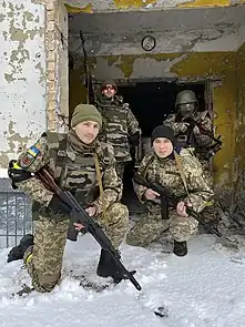 Under the order by President Volodymyr Zelenskyy, the unit was created to join the defence against the 2022 Russian invasion of Ukraine, and its formation was announced in a statement by the Ukrainian Foreign Minister Dmytro Kuleba on 27 February, three days after the invasion began.[10][11] Kuleba promoted the unit on Twitter, inviting individuals to apply and stating that "together we defeated Hitler, and we will defeat Putin too."[12] On 7 March, the Ukrainian Armed Forces released the first image of International Legion soldiers in trenches on the outskirts of Kyiv and announced that new groups were being deployed to the front each day.[13]