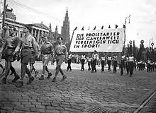 National flags were not used, but a red flag of international workers' movement.[1] The best athletes were awarded with diplomas, they did not receive medals like in the Olympic Games.[3] The visiting athletes stayed mostly at private accommodation of local families.[1]