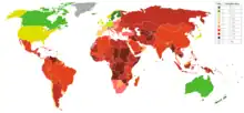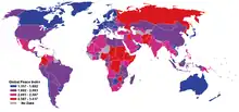 World map of the Global Peace Index. Countries appearing more blue are ranked as more peaceful on the Index, countries appearing more red are ranked as less peaceful.