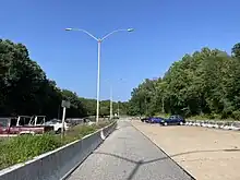 However, many of the civic groups still opposed I-70 passing through Gwynns Falls/Leakin Park; the groups used litigation and political will to indefinitely delay the construction of I-70 through the park.[54] In 1981, the city canceled the portion of I-70 from its current eastern terminus through Gwynns Falls/Leakin Park to the Interstate's interchange with I-170. I-170 and the portion of proposed freeway south to I-95 remained part of plans with a new designation for the L-shaped freeway, I-595.[9] However, in 1983, I-595 was canceled as well due to escalating costs; saving funds for the original I-595 freeway would detract from more pressing needs like maintenance of city streets and rapid transit.[9][54] I-595 was later used as an unsigned designation for the upgrade of US 50 between the Capital Beltway and Annapolis.[1] With the abandonment of I-70's extension further into the city, the Baltimore City Department of Transportation converted the Interstate's stub end east of Security Boulevard (MD 122) into a park and ride facility that opened in September 1985.[55] At the once-planned I-95 interchange, a flyover ramp that was to become the ramp from eastbound I-70 to southbound I-95 was demolished in 1997, though several other ramp stubs remain in place.