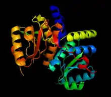 The gene encoding this enzyme has been recently identified.[12][13] The sequence of amino acids of iodotyrosine deiodinase is highly conserved among mammals and contains three domains.[8] Iodotyrosine deiodinase is a membrane protein, with the N-terminus functioning as a membrane anchor.[11][17] It forms a dimer that is domain-swapped.[14] Initially, iodotyrosine deiodinase was thought to contain only one flavin mononucleotide (FMN) in each dimer,[18] but now iodotyrosine deiodinase is believed to have two FMN molecules for each homodimer.[14] The enzyme has a characteristic α-β fold that all proteins from the NADH oxidase/flavin reductase superfamily have as well. Within the dimer interface, there are two equivalent active sites, each made from residues from both subunits. Thus, subunit association must be required for FMN binding and catalysis. Substrate binding causes a conformational change in the enzyme in order to close the active site, protecting the substrate and flavin from the solvent.[14]