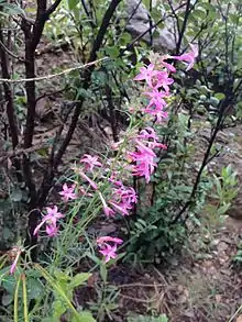 Holy Ghost ipomopsis is a perennial herb growing 30 to 80 centimeters (12 to 31 in) tall.[5] The leaves are mostly located around the base of the plant and wither as the plant flowers. Leaves on the stem become smaller toward the top. The inflorescence is a number of clusters of flowers, one at the tip of the stem and a few along the sides of the upper stem. The flower is bright pink with a thin tubular throat up to 2 centimeters (0.79 in) long opening into five pointed lobes each nearly 1 centimeter (0.39 in) in length. Blooming occurs in July through September.[6]