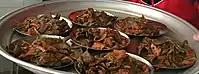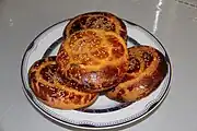 The Azerbaijani people, living primarily in the region of Azerbaijan in northwestern Iran, have a number of local dishes that include Bonab kabab (Binab kababı),[80] the dumpling dish of joshpara (düşbərə), an offal-based dish named jaqul baqul typically containing liver and heart,[81] a variety of āsh called kələcoş,[82] a variation of qeyme that is called pıçaq, and a variation of kufte that is called Tabriz meatballs. There is also the traditional pastry of shekerbura (şəkərbura), which is identical to Khorasan's shekarpare (šekarpāre). Despite the influences from Turkey, the food tastes noticeably Iranian, though also with its own unique features, such as using more lemon juice and butter than other groups of Iranians.[83]