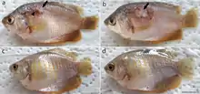 Dwarf gouramis infected with another disease displaying ulcers, a common symptom of DGD | |