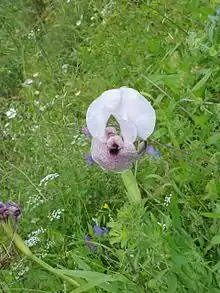 Iris lortetii (also known as Lortet's iris or in Israel as the Samarian iris) is a species in the genus Iris. It has straight grey-green leaves, a 30–50 cm tall stem, and large showy flowers in late spring or mid-summer that come in shades of pink, from white, lilac, pale lavender and grey-purple. It is veined and dotted pink or maroon. It has a signal patch that is deep maroon and a sparse and brown, purple-brown or reddish beard.
