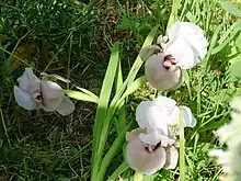 Like other irises, it has 2 pairs of petals, 3 large sepals (outer petals) known as the 'falls', and 3 inner, smaller petals (or tepals, known as the 'standards'.[16] The falls are oblong-obovate shaped and recurved (bent backwards),[4] with maroon,[7] brown,[6] or crimson,[3] lilac to pink dots and veins on a pale blue, lavender,[3] pale cream or yellowish ground.[9] It has a small deep maroon coloured signal patch,[15] and in the middle of the falls, is a row of short hairs called the 'beard', which is sparse and brown,[11] purple-brown or reddish in colour.[5] The paler standards are orbicular shaped, with pale lilac veins on a nearly white ground.[5]