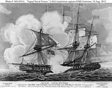 On August 19, 1812, USS Constitution encountered the British frigate HMS Guerriere at sea. As Constitution's crew went to quarters, Hull cautioned his gunners: "No firing at random. Let every man look well to his aim."[22] Captain James Richard Dacres of Guerriere at first tried to cripple Constitution at long range, but quickly found this tactic of no avail. He then approached Constitution at close range. All the while Captain Hull kept his crew calm telling them "I'll tell you when to fire, so stand steady and see that not a shot is thrown away." At 6:05 the two ships were alongside and Constitution's starboard guns, at Hull's orders, poured in a broadside of "double-shotted" (two round shots loaded in one gun and fired at the same time). Writing on August 28, 1812 to Secretary of the Navy Paul Hamilton, Hull recalled, 'when we were within less than a pistol shot, we commenced a very heavy fire from all our guns, loaded with round and grape, which done great Execution, so much that within fifteen minutes from the time we got alongside, his Mizzen Mast went by the board, and his Main Yard in the Slings and the Hull and Sails very much injured, which made it difficult for them to manage her." Hull continued: the enemy put his helm to port, "at the time we did, but his Mizzen Mast being over the Quarter prevented her coming too, which brought us across his Bow, when his Bowsprit over our Stern. At this moment I determined to board him, but the instant the Boarders were called, for that purpose, his Foremast and Main Mast went by the board and took with them the Gib boom and every spar except the Bowsprit ... we stood off for about half an hour to repair our braces and other riggings that had been shot away and wore around to return to the enemy, it being now dark we could not see whether she had any colors flying or not." Moses Smith, a seaman, would later recall "Several shot now entered our hull. One of the largest the enemy could command struck us, but the plank was so hard it fell out and sank in the waters. This was afterwards noticed and the cry arose: 'Huzza! Her sides are made of iron! See where the shot fell-out!' From that circumstance the name of the Constitution was garnished with the familiar title."[23] USS Constitution had pounded HMS Guerriere into a wreck.