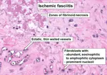 - 1 2 3 4 5 6 7 8 9 Liegl B, Fletcher CD (October 2008). "Ischemic fasciitis: analysis of 44 cases indicating an inconsistent association with immobility or debilitation". The American Journal of Surgical Pathology. 32 (10): 1546–52. doi:10.1097/PAS.0b013e31816be8db. PMID 18724246. S2CID 24664236.