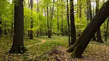 Izmaylovsky forest has a territory of 1608.1 hectares.[7] The forest has a big diversity of plant species, including those that are endangered and are monitored by the Preservation agencies (almost 50 species). Rarely observed in urban areas, the transitional bog of the forest has originated from growing of the sphagnum moss. There are more than 25 species of lichens and 75 species of moss. The major part of the forest consists of deciduous trees, such as linden tree, oak, birch, maple. The Eastern part of the forest is constituted mainly by pines and firs that are more than hundred years old and were planted in the middle of 19th century as a part of the forest restoration effort. In total, more than 500 species are presented within the biological diversity of the forest. Some flowering plants are also preserved: various species of lilies, including Turk's cap lily, orchids, etc. Many species are registered medicinal plants and are listed in the Russian Pharmacopoeia (The State Pharmacopoeia of the Russian Federation), such as bistort Bistorta officinalis.