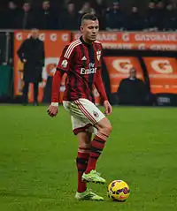 On 23 November, Ménez scored a beautiful goal as he calmy converted El Shaarawy's cross in the far net in the Derby della Madonnina against Inter. He then scored two goals and was named man of the match in the next game against Udinese. Ménez also continued his impressive form and scored a beautiful goal as he dribbled past 3 defenders and put it in the net as he helped Milan beat Napoli 2–0.[63] Ménez scored two goals and created an assist in the 3–1 defeat of Parma on 1 February.[64] He followed this with a penalty in a 2–2 draw with Hellas Verona on 7 March and a brace in a 3–1 defeat of Cagliari on 21 March, hitting a career high in goals for a single club (15, surpassing his previous best of 14 for PSG). On 4 March 2015, Ménez scored the winning goal after a long solo run against Palermo in a 2–1 victory, Milan's first away win of 2015. Ménez's season, however, ended poorly; on 29 April 2015, he was sent off for a second bookable offensive during the 3–1 defeat against Genoa and was handed a four-match ban for an insulting gesture, also missing the team's last match against Atalanta due to an injury.[65] Ménez ended his first season at Milan as the club's top scorer, with 34 appearances and 16 goals in all competitions.