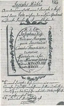 Here lays József Kiss, a Hungarian noble. He is immortal, for the Franz channel stands. He is mortal, for this cold marble. He was born in Buda 14 days before the April calends of 1748. He died in Sombor, among his friends from Bačka, on the third day of the March idas of 1813.
