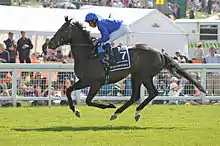 Three weeks after his defeat at Epsom, Jack Hobbs was sent to Ireland for the Irish Derby at the Curragh on 27 June. It was the 150th running of the event and the Irish Turf Club invited many previous winning owners, trainers and jockeys to the race which was regarded as the most competitive renewal for several years.[18] Giovanni Canaletto and Storm The Stars were again in opposition, as well as The Oaks winner Qualify, the Prix du Jockey Club runner-up Highland Reel and the previously undefeated Radanpour. Starting the 10/11 favourite he was settled in third place by Buick before moving into second behind Storm The Stars in the straight. He took the lead a furlong and a half from the finish and drew away to win by five lengths from Storm The Stars, with a further five and a half lengths back to Giovanni Canaletto in third.[19] He was the first British-trained colt to win the race since Commander in Chief 1993. After the race Buick commented "I had a lot of belief in him before Epsom and he was even better today. He's a horse that's improving all the time. It's fantastic to win an Irish Derby, but it's just great to ride horses like him. He's been handled brilliantly by John. He's obviously a late maturing horse, but he's really coming to himself now and he's a serious horse."[20] Announcing his plans for the winner, Gosden said "We'll put him away for the Prix Niel at Longchamp and go for the Arc after. He'll be better at four because he's quite light framed and needs to fill out."[21]