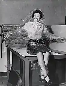 Shown at left is a 1946 photo that is more inventive and playful than her usual workmanlike news photos. She took it while working for the International News Photos service during preparation of a news feature on the archives. It shows a staff member wrapped in the transparent acetate foil that conservators used to laminate sheets of paper. Despite the gimmickry the photo shows techniques that Martin commonly employed. She shot the subject head-on, lit by flash held high on the left. She staged the scene to eliminate distracting details. The female subject was shown sympathetically, her pose and facial expression displaying cheerfulness and determination to be a good sport. The format was 3 x 4 and the camera probably a Speed Graphic.[27]