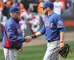 ![]() Moore (left) with the Texas Rangers in 2011 | |