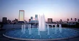 Jacksonville's early predominant position as a regional center of business left an indelible mark on the city's skyline. Many of the earliest skyscrapers in the state were constructed in Jacksonville, dating to 1902.[68] The city last held the state height record from 1974 to 1981.[69] The tallest building in Downtown Jacksonville's skyline is the Bank of America Tower, constructed in 1990 as the Barnett Center. It has a height of 617 ft (188 m) and includes 42 floors.[70][71] Other notable structures include the 37-story Wells Fargo Center (with its distinctive flared base making it the defining building in the Jacksonville skyline),[72][73] originally built in 1972–1974 by the Independent Life and Accident Insurance Company, and the 28-floor Riverplace Tower. When this tower was completed in 1967, it was the tallest precast, post-tensioned concrete structure in the world.[74][75]