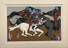 Between 1954 and 1956 Lawrence produced a 30-panel series called "Struggle: From the History of the American People" that depicted historical scenes from 1775 to 1817. The series, originally planned to include sixty panels, includes references to current events like the 1954 Army-McCarthy hearings, and they sometimes explore relatively obscure or neglected aspects of American history, like a woman, Margaret Cochran Corbin, in combat or the wall built by unseen enslaved Blacks that protected the American forces at the Battle of New Orleans.[14] Rather than traditional titles, Lawrence labeled each panel with a quote, either to add an individual voice to his work or inject weighted vocabulary. Patrick Henry's speech, famous for the phrase "Give me liberty or give me death", he captioned with a different passage: "Is life so dear, or peace so sweet, as to be purchased at the price of chains and slavery." A panel showing Blacks fighting against the British is captioned with the words of a man who sued for emancipation from slavery in 1773: "We have no property! We have no wives! No children! We have no city! No country!"[15] Three panels (Panels 14, 20 and 29) are lost, and three others were only located in 2017, 2020, and 2021.[16] The fraught politics of the mid-1950s prevented the series from finding a museum purchaser, and the panels had been sold to a private collector who re-sold them as individual works.[17]