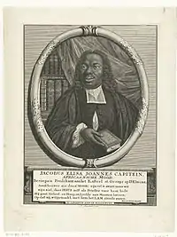 The man who would become known as Jacobus Capitein was born c. 1717 in Elmina, Western Africa, which was part of the Dutch Gold Coast.[1] The identities of his parents are unknown, though he was "orphaned by war or some other cause".[2] At the age of seven or eight he was captured and enslaved by slave traders of unknown identity, who sold him to a Dutch ship's captain and slave trader named Arnold Steenhart.[3] Steenhart subsequently gifted him to a fellow slave trader, Jacobus van Goch, who was residing in Elmina.[4]