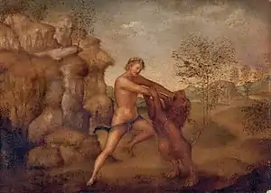 Hercules and the Nemean Lion, oil on panel painting attributed to Jacopo Torni