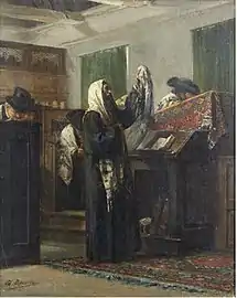 Brandon was of Sephardic Jewish heritage, and after his return to Paris in 1863 his subject matter shifted largely to Jewish themes. Many of his later paintings featured rabbis and synagogues; one example is Scene in a Synagogue (1868–1870), now in the collection of the Philadelphia Museum of Art. At Degas' invitation, Brandon displayed five paintings in the 1874 show that later became known as the first Impressionist exhibition.[5] Three of the works that Degas entered in that exhibit were owned by Brandon.[6]