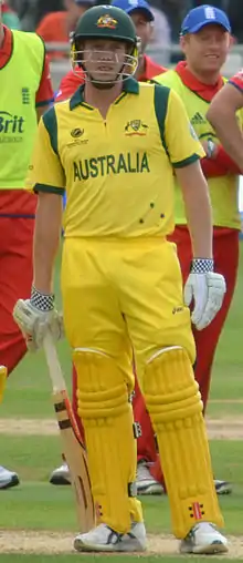 Faulkner made his international debut for Australia in a 2012 Twenty20 International against India.[13] He toured England in 2013 and was selected for the fifth Ashes Test of the tour. Australian selector John Inverarity described Faulkner as the sort of player who "gets things done",[14] while captain Michael Clarke said that Faulkner could provide some toughness that Australian might have lacked in previous matches on the tour.[15]