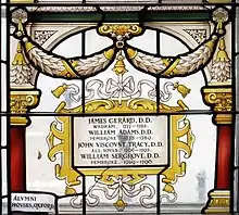 ![]() Stained glass in the Grundy Library at Abingdon School containing the name of James Gerard | |