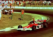 Lauda's injuries kept him out of the following two races, allowing Hunt to close the gap in the championship chase. At Zandvoort, Hunt overtook Ronnie Peterson on the 12th lap and resisted pressure from John Watson to win.[31] At the Italian Grand Prix, the big story was Lauda's miraculous return from his Nürburgring accident. At a circuit that should have suited Hunt's car, the Texaco fuel McLaren were using was tested and although apparently legal, their cars, and those of the Penske team, were judged to contain a higher octane level than allowed. Subsequently, both teams were forced to start from the rear of the grid. While trying to make his way up the field, Hunt spun off, and Lauda finished fourth. At the next round in Canada, Hunt found out that he had been disqualified from the British Grand Prix and Lauda had been awarded the victory and thus received three additional points. A furious Hunt drove a very hard race at the challenging Mosport Park circuit and won. At the penultimate round in the United States at the daunting Watkins Glen track, Hunt started from pole and took victory after a close battle with Jody Scheckter.[32] This set the stage for the final round in Japan. Hunt's late season charge pulled him to just three points behind Lauda. The sliding scale of points for the top six finishers meant that Hunt needed to finish fourth (worth 3 points) or better to overtake Lauda in the championship. Lauda needed to earn two points fewer than Hunt, or better, to stay ahead. McLaren team manager Alastair Caldwell had taken advantage of the gap between the final two races to hire the Fuji circuit – a track hosting its first Grand Prix and therefore unknown to all the teams – for an exclusive McLaren test. After a few laps the gearbox seized, bringing the test to a premature close, but the team had had the advantage of acclimatising themselves to the new circuit. Conditions for the race itself were torrentially wet. Lauda retired early on in the race, unable to blink because of facial burns from his accident in Germany.[33] After leading most of the race Hunt suffered a puncture, then had a delayed pitstop and finally received mixed pit signals from his team. But he managed to finish in third place, scoring four points, enough for him to win the World Championship by one point.[34] Hunt was the last British Formula One champion until Nigel Mansell won the 1992 championship for Williams.[35] He was, relatively, one of the cheapest F1 World Champions ever, having signed at the last minute for $200,000 – a scenario similar to that of 1982 champion Keke Rosberg.